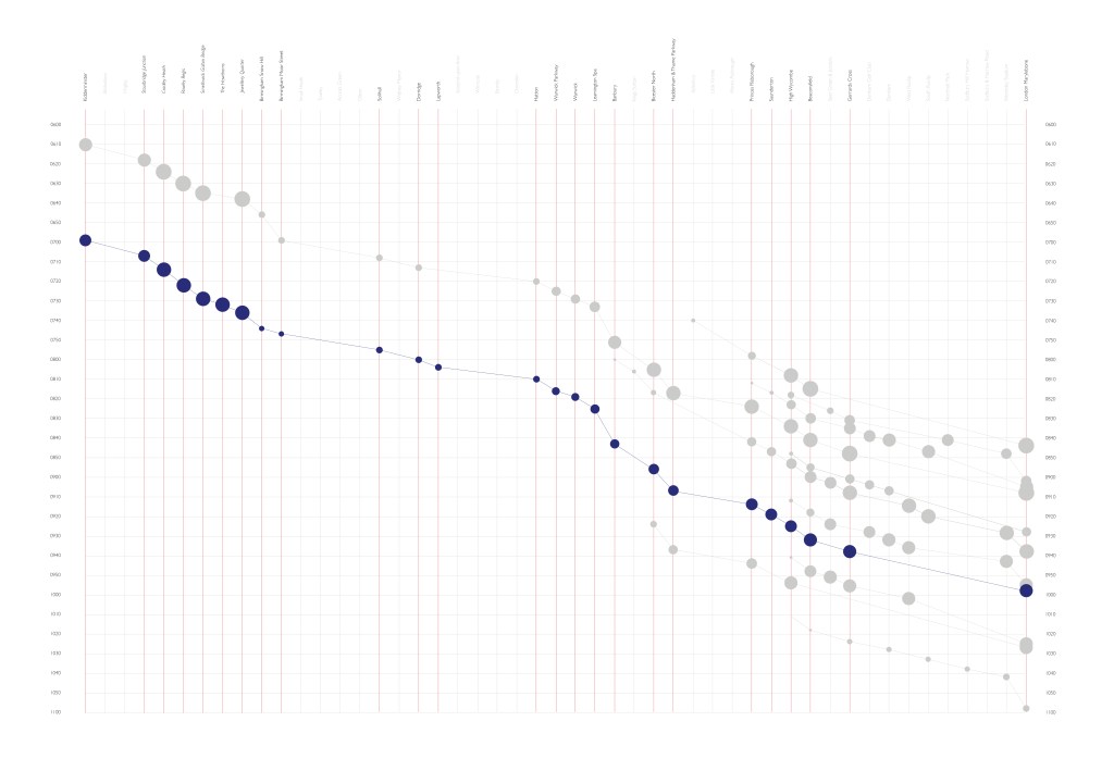 The brief for this project was to find a way to improve a daily journey in a way that improves it for many people. I looked at my own journey to London and noticed that there were often two or three trains leaving close together, usually a fast service followed by a semi-fast and then a stopping one. I observed a lot of people rushing for the fast service even though the slower ones were a lot emptier. I decided that it’d be interesting to create a data visualisation of crowd levels on each train, so people were able to see that they were able to have a much more comfortable journey if they were willing to arrive at their destination just a few minutes later.
